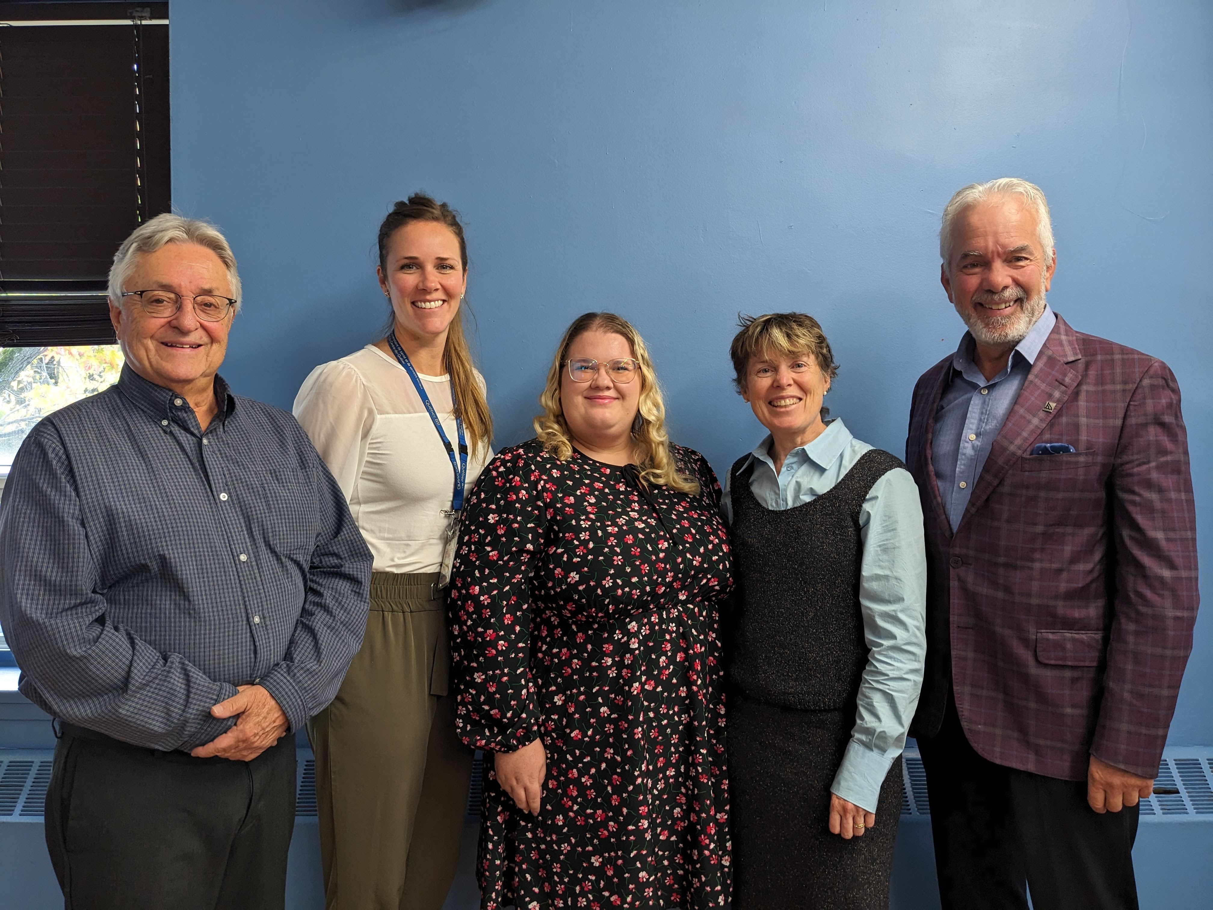 De gauche à droite : Yves Bouchard, citoyen partenaire et président de la FADOQ - Région Mauricie; Danielle Thibault, cheffe d'administration des programmes intérimaire au CIUSSS de la Mauricie-et-du-Centre-du-Québec; Claudia Martineau, agente de concertation et de soutien à la Corporation de développement communautaire de Trois-Rivières; Anik Giguère, chercheuse principale du programme Proactif pour éviter la fragilisation; Daniel Cournoyer, maire suppléant de la Ville de Trois-Rivières.