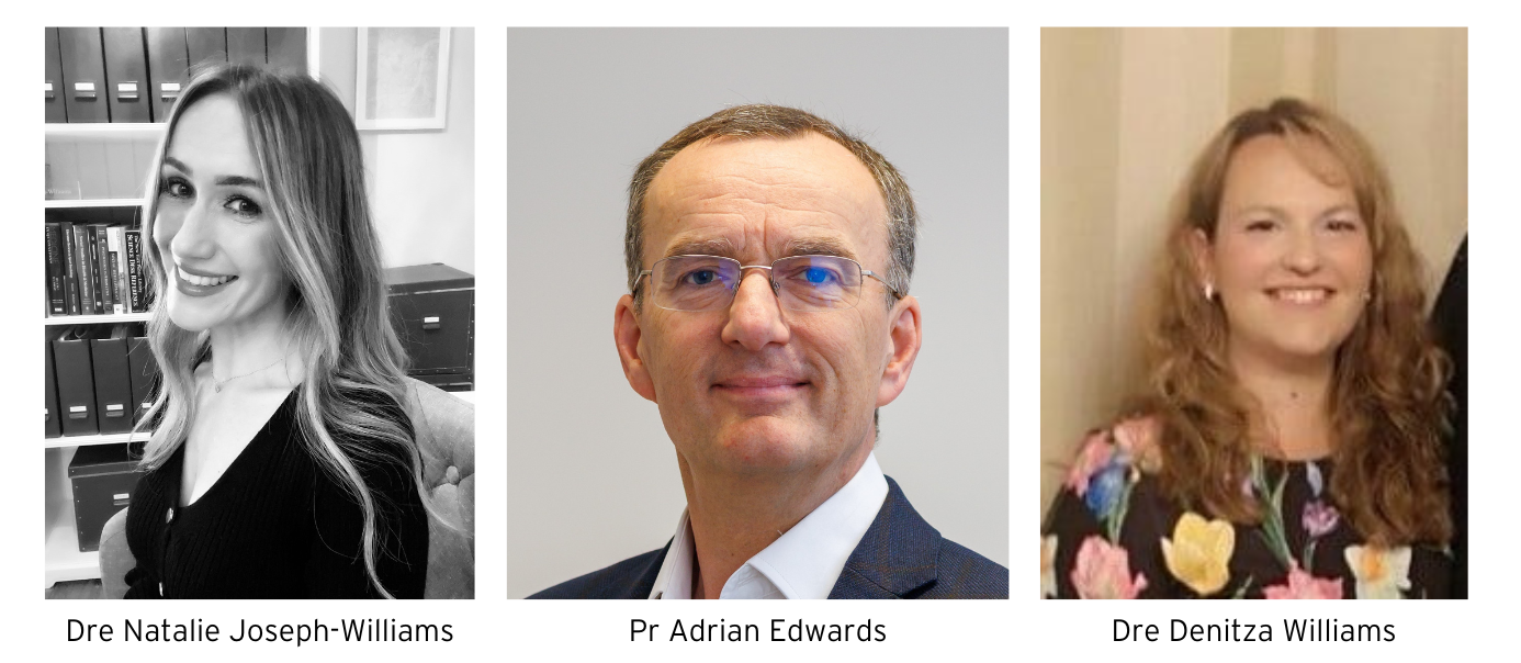 Dre Denitza Williams (PhD) est maître de conférences à l’école de médecine à l'Université Cardiff. Elle se spécialise dans la recherche sur les services de santé et des méthodes de recherche qualitative, particulièrement en lien avec la PDP dans a santé des femmes. Elle a mené plusieurs projets de recherche utilisant des devis mixtes pour évaluer les besoins, développer et évaluer des interventions de prise de décision partagée dans la santé des femmes pour des affections telles que la maladie rénale chronique, le cancer du sein, les maladies rhumatismales auto-immunes et le dépistage du cancer du col de l’utérus. Elle travaille en étroite collaboration avec des organisations nationales et internationales telles que la direction de santé publique et le gouvernement du pays de Galles, la DSP d’Angleterre et l’OCDE (organisation de coopération et de développement économique.